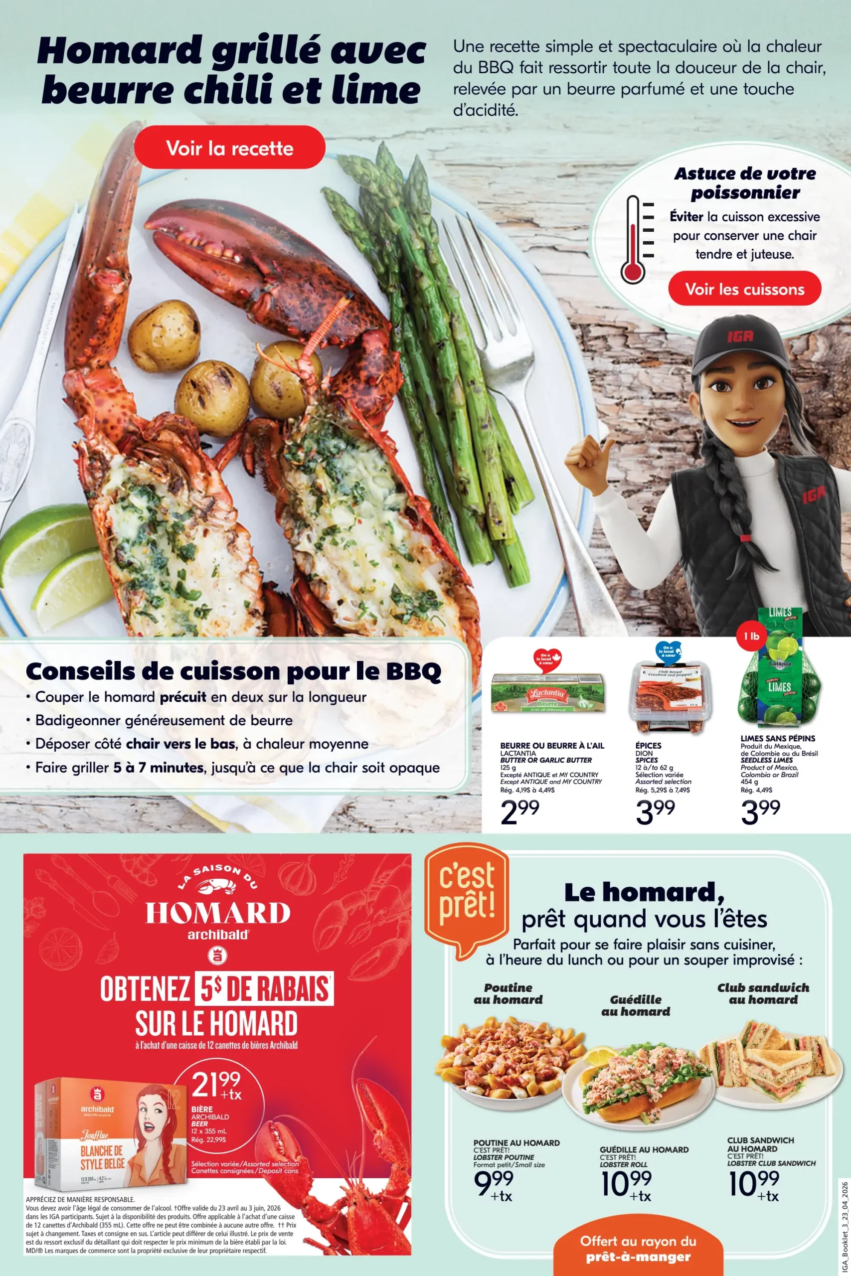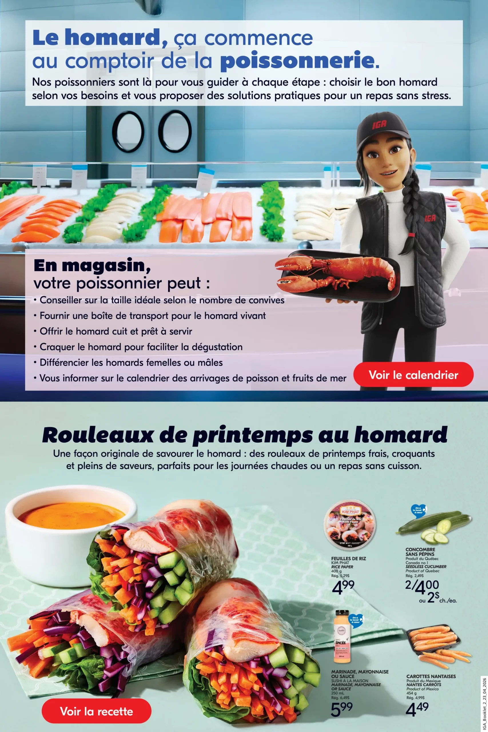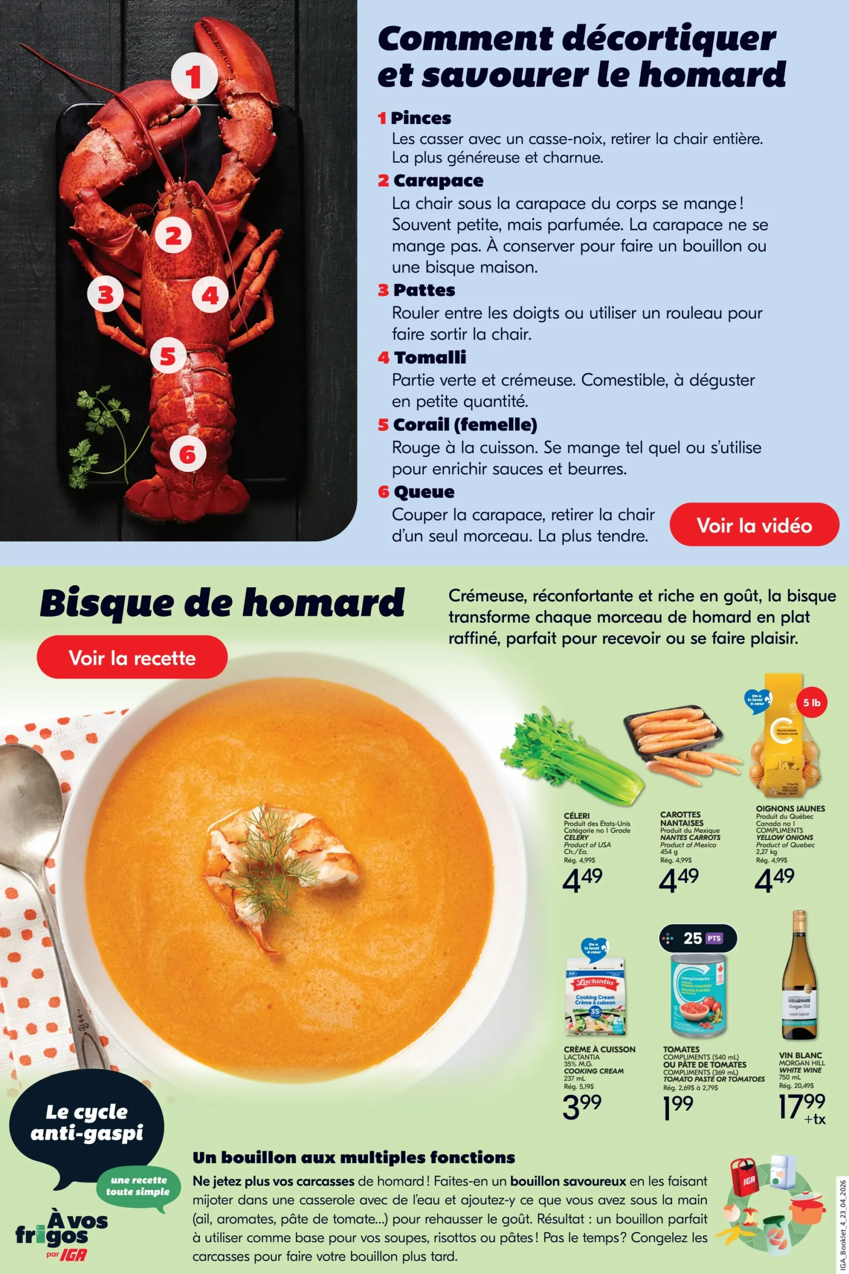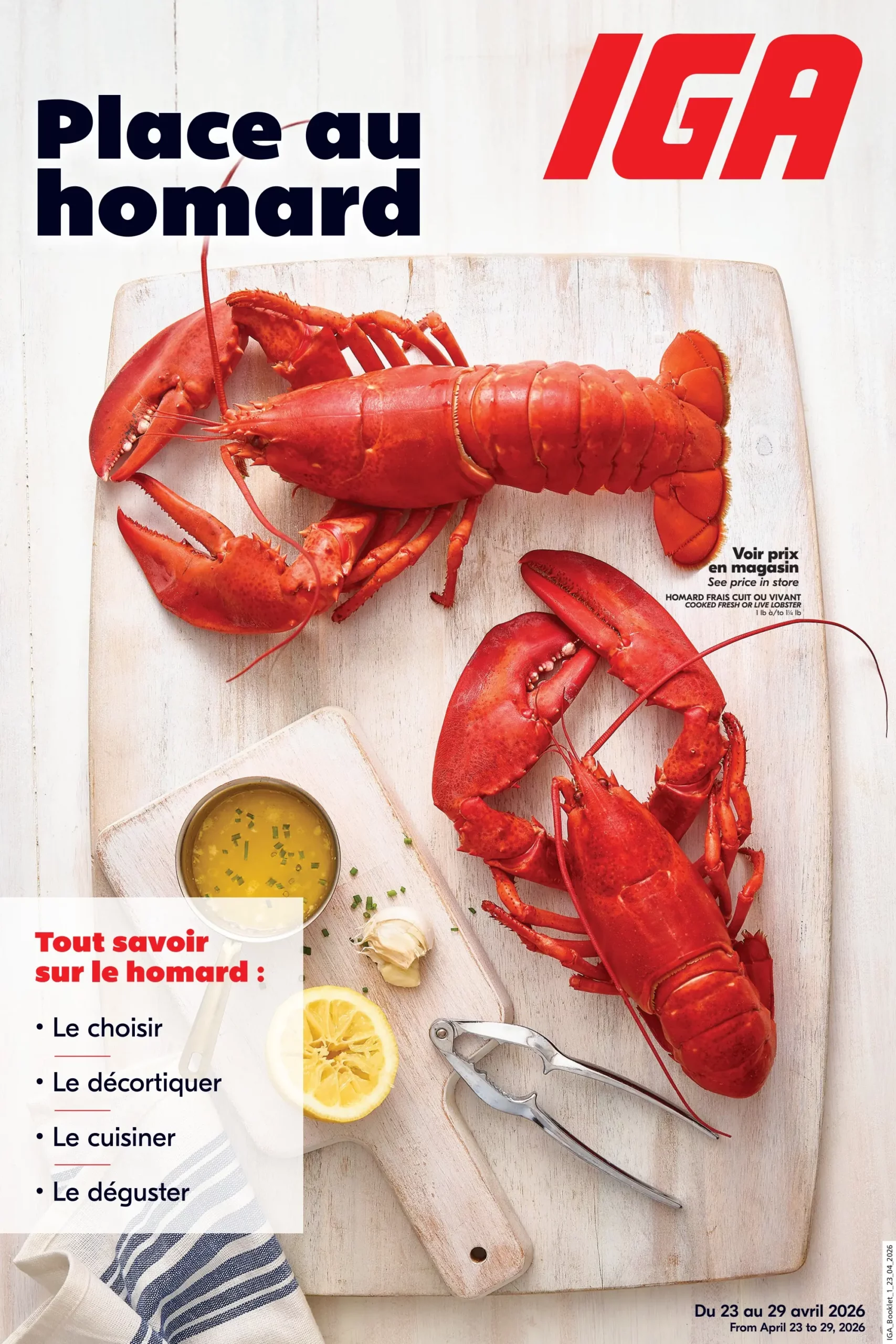 Circulaire IGA Place au Homard du 23 au 29 Avril 2026 253 Share on Facebook Share on Twitter Share on Pinterest Share on Email Share on Whatsapp Un p’tit avis sur Trustpilot , pis tu fais notre journée! ☀️ Trustpilot Quelques offres spéciales de la semaine IGA – Place au homard Homard Prix en magasin – en spécial cette semaine Voir toutes les circulaires de ce marchand : IGA, Magasinez par région : Abitibi-Témiscamingue, Bas-Saint-Laurent, Capitale-Nationale, Centre-du-Québec, Chaudière-Appalaches, Côte-Nord, Estrie, Gaspésie–Îles-de-la-Madeleine, Lanaudière, Laurentides, Laval, Mauricie, Montérégie, Montréal, Nord-du-Québec, Outaouais, Saguenay–Lac-Saint-Jean