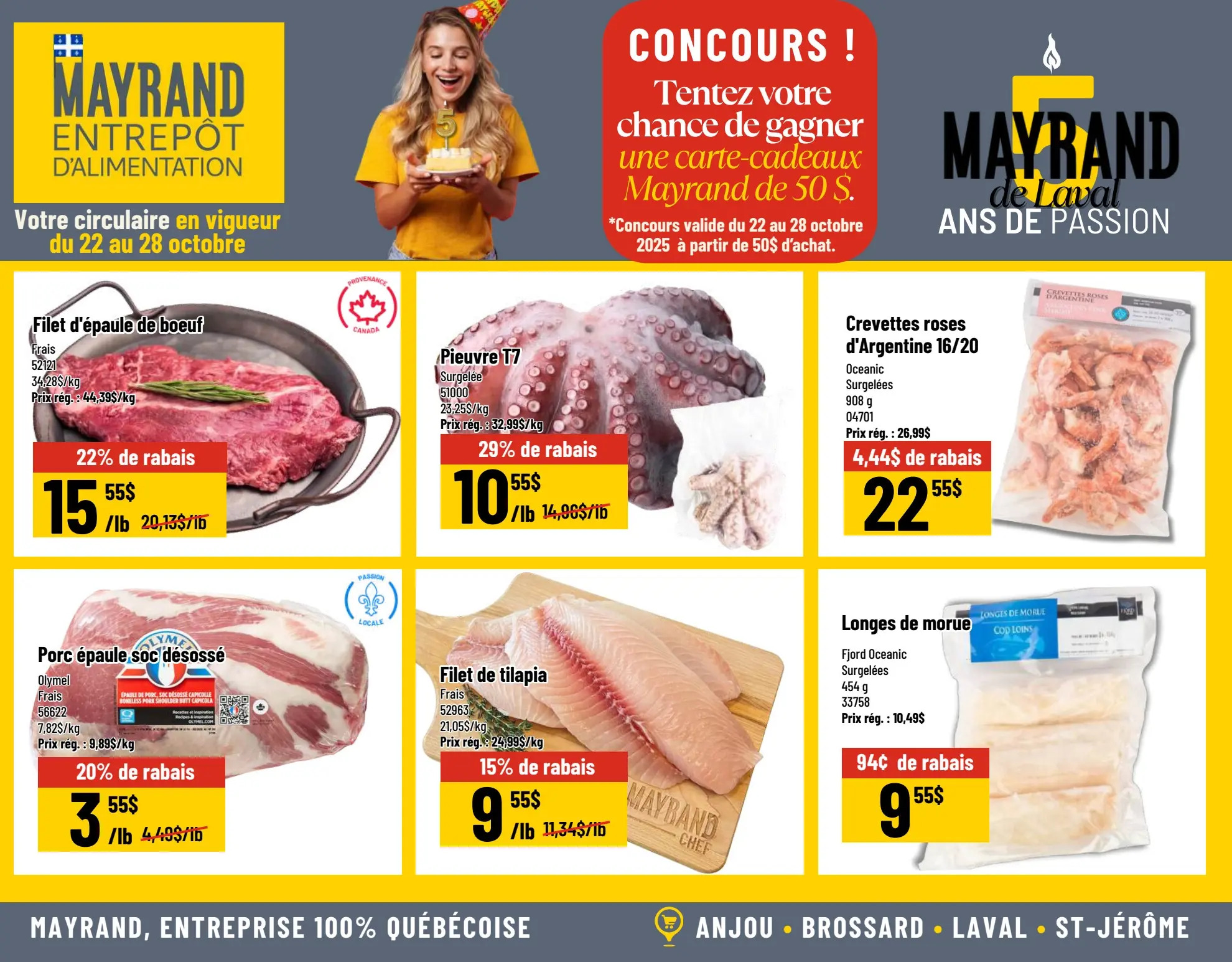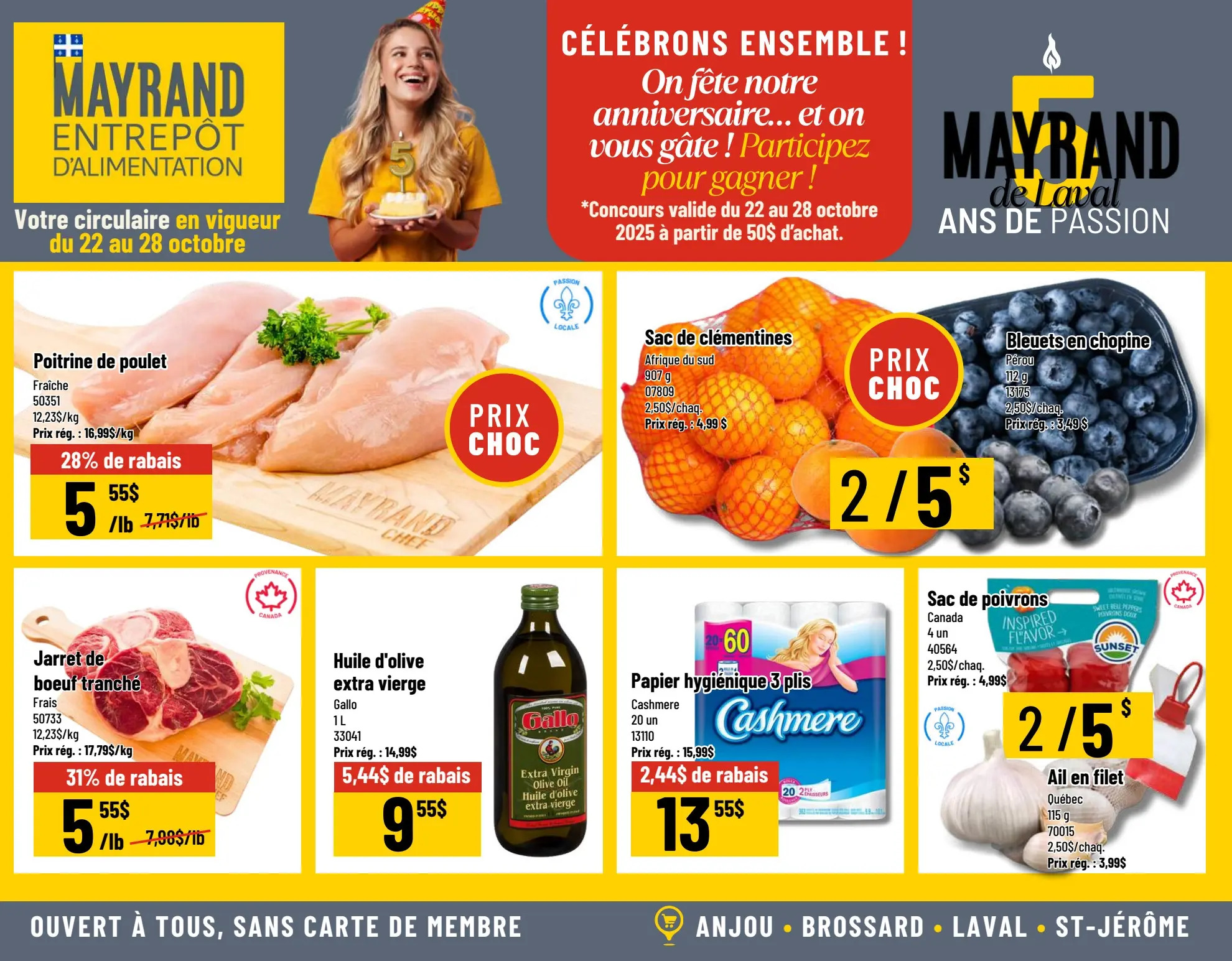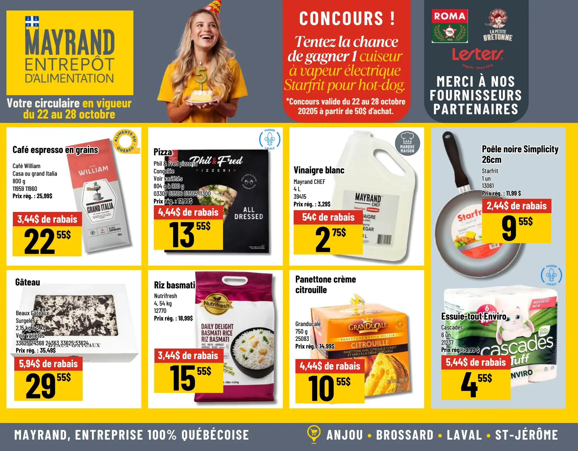 Parcourez et consultez la Circulaire Mayrand Entrepôt D’alimentation Du 22 au 28 octobre 2025 de Mayrand pour voir ce qui est spécial dans cette semaine afin de ne jamais manquer une occasion d'obtenir les meilleurs prix. Recherchez des offres et décidez où vous allez acheter avec nos circulaires. Si vous appréciez les bonnes affaires et que vous voulez en tirer le meilleur parti, visitez notre page Circulaire Mayrand Entrepôt D’alimentation Du 22 au 28 octobre 2025 de Mayrand.